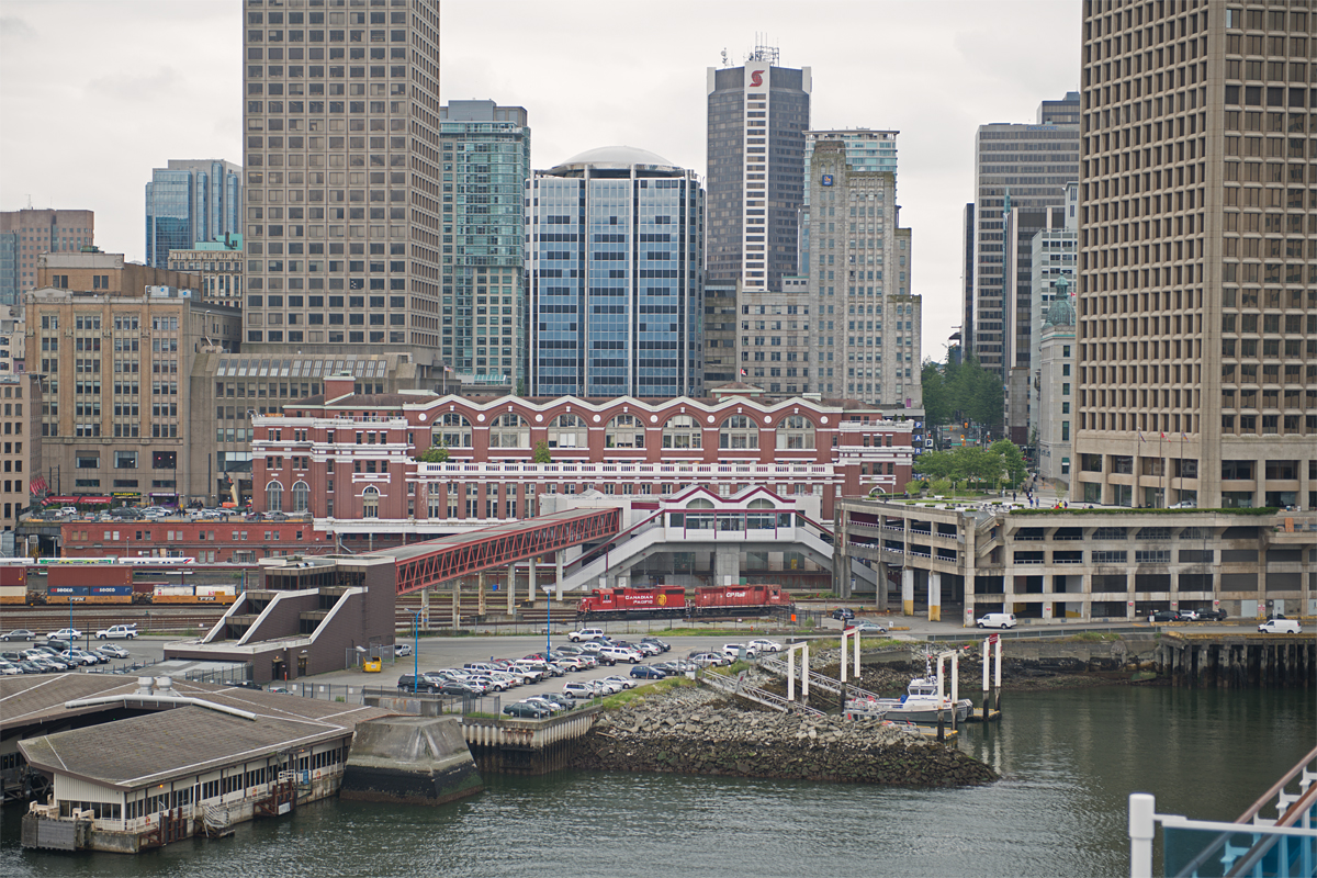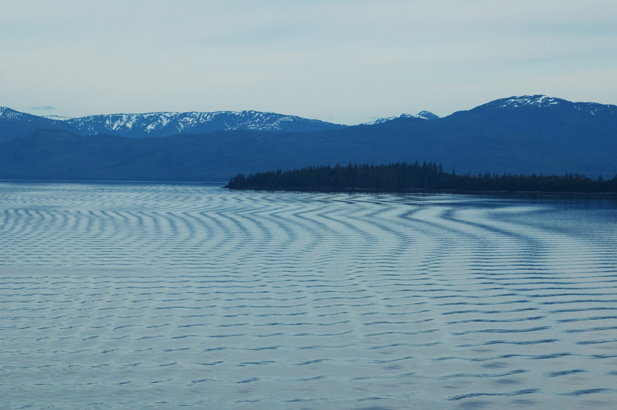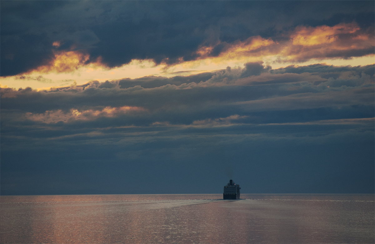 Our cruise ship, the Diamond Princess, departed Vancouver on June 8th. Mr Jackson sent an old friend, CP 1126, to wish us farewell. We were in cloud as we slid (barely) under the Second Narrows Bridge, but thereafter we saw lots of sun. For the first day and two nights, we sailed up the Strait of Georgia and on through Queen Charlotte Sound. At the cocktail hour, we were treated to plumes of spray from humpback whales. There were lots of clouds, and gorgeous sunsets, and other ships. And all manner of waves.