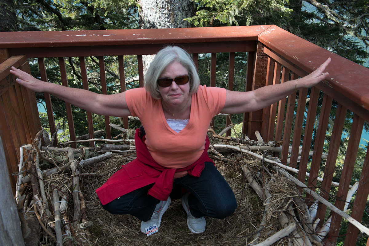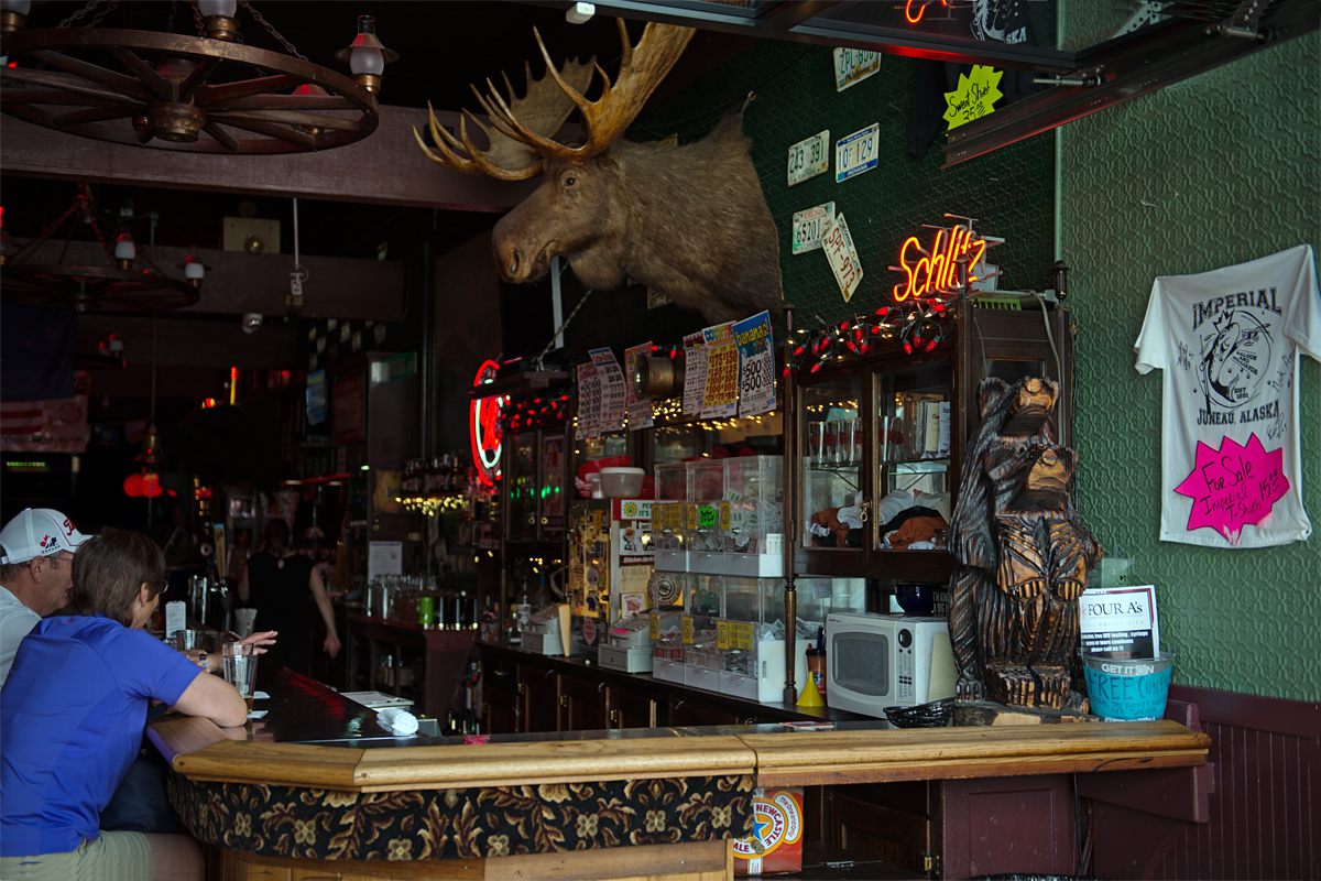 Juneau, Alaska’s landlocked state capital, was the most likely to get a return visit. There were several good pubs, and easy access to the great outdoors. We took a ride up the cable car, netting a great view of the town and a hoary marmot sighting (really!) while watching crazed tourists tearing down the slopes on improvised toboggans. (It wasn’t quite spring up there). Jan checked out an eagle’s nest….there were many bald eagles soaring over the fjord. Then we rode a vintage bus to the Mendenhall Glacier for a nice hike…..under blazing sun. Then we sampled more local beers. White (wheat) ales and India Pale Ales seem to be the favourites out there.