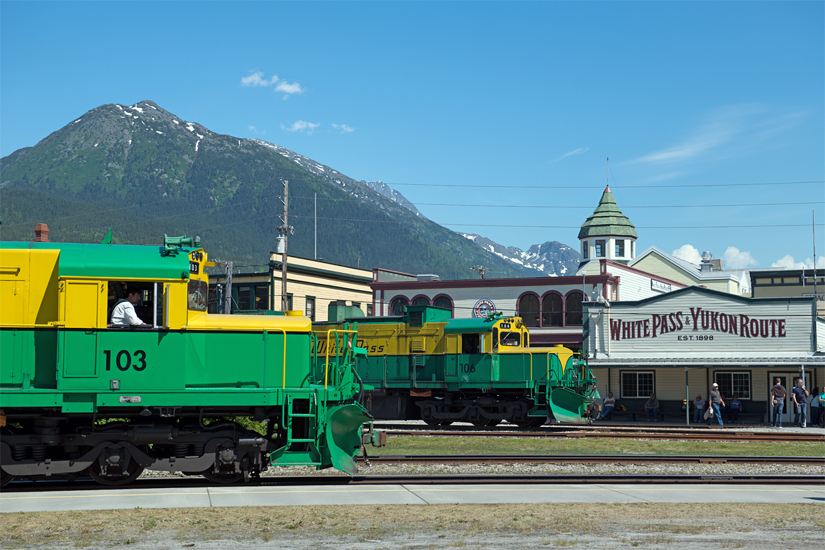 Skagway is a small shopping strip and a train station. The cruise ships tie up at the end of the main street. The tourist shop thing was getting stale, so we walked the extra mile to the train yards – a very pleasant stroll in crisp clear air. Then we returned to the quay to board the White Pass excursion.