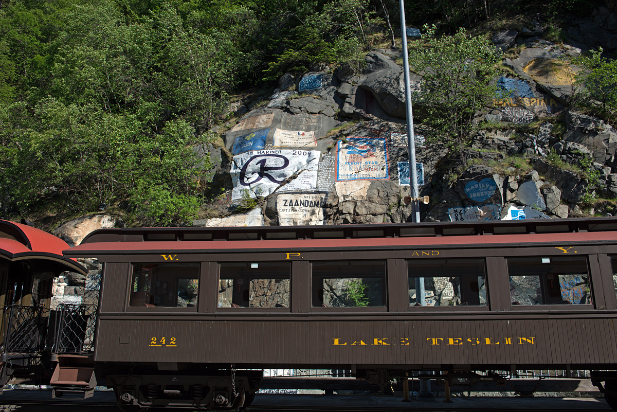 Back at the docks, we saw one last bit of pioneering. It’s a Skagway tradition that every visiting ship paints its emblem on the rocks. There must be a lot of hardnosed ship captains to send their seamen up those heights.