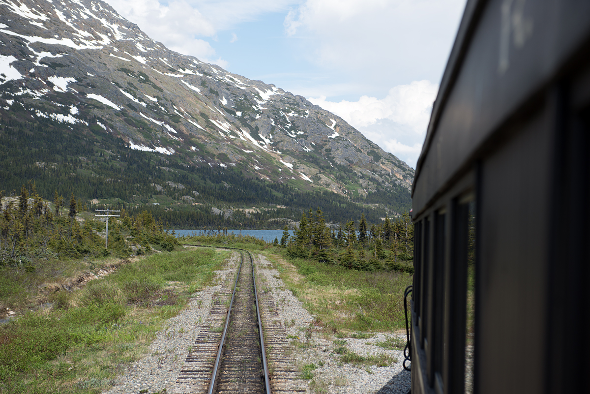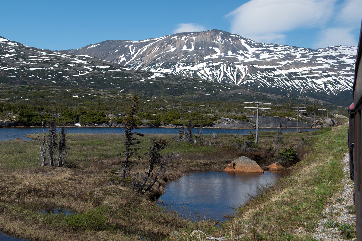 At the turning point, the train pulled into a loop track, pausing to clear a following train bound for the end of track further up the line at Carcross, YT. I stood in the open vestibule, eyes glued to the view.
