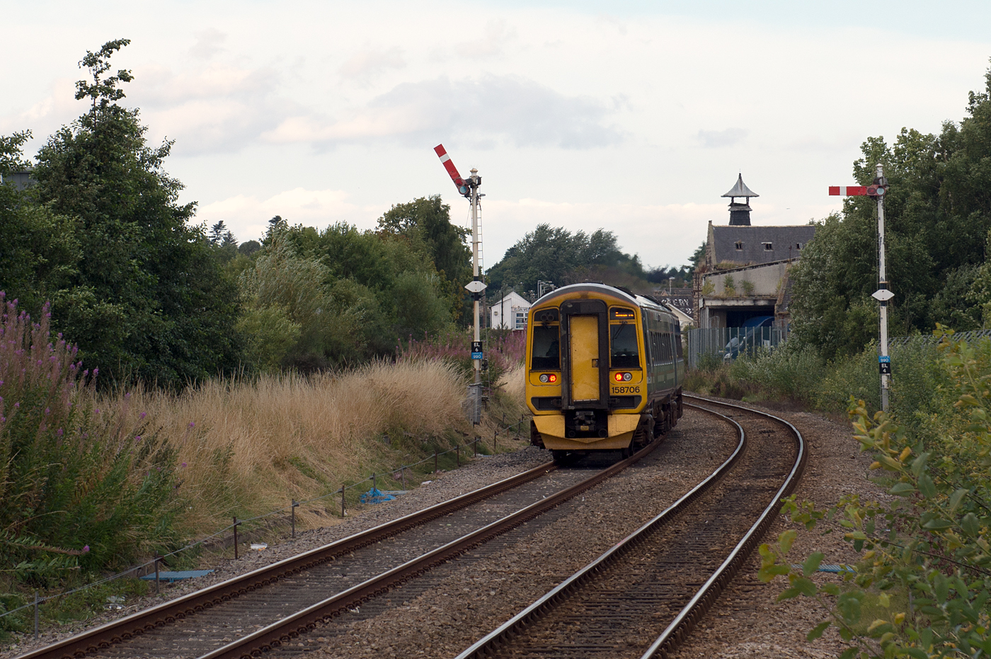 At both Forres and Elgin, vintage signalboxes, controlling both ends of the passing sidings, still operate 24/7. This route is operated on a token system, with each train exchanging tokens with the signal box operator before continuing its journey.