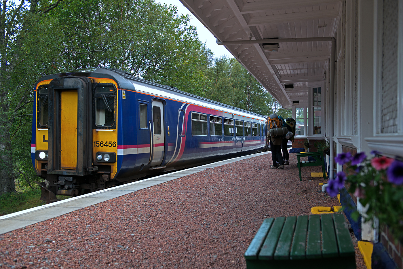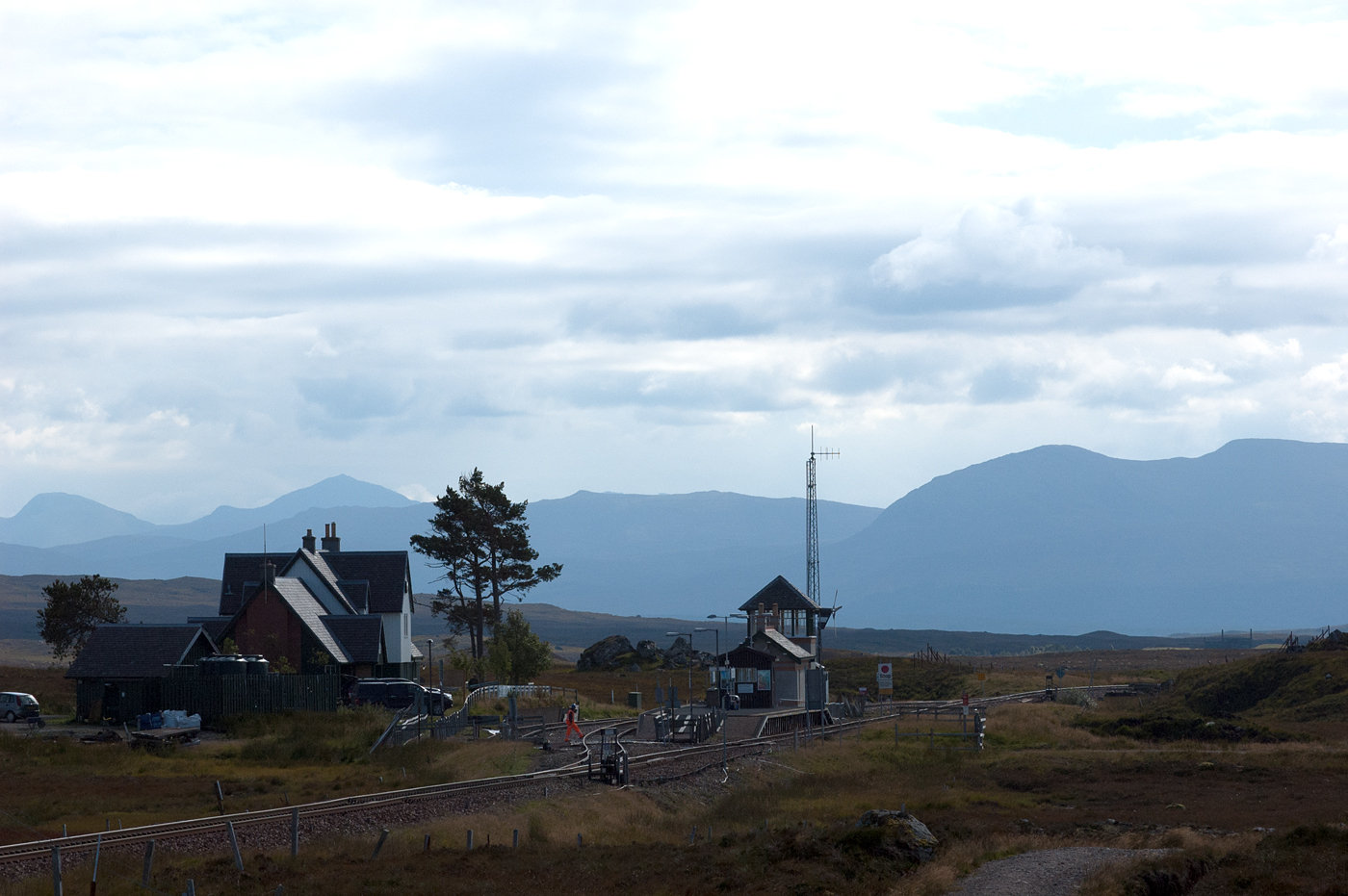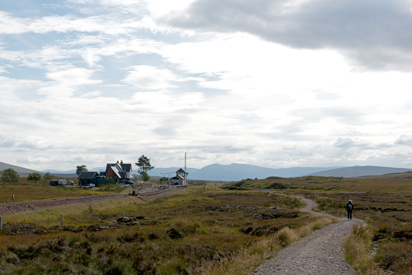 Corrour can be reached only by train, at the north end of Rannoch Moor. There are hiking trails leading in several directions, one leading to a youth hostel on a Loch a mile to the east. The only buildings at Corrour are the station platform and a guest house with a daytime tea room. The nearest town is many miles away. We left our bags on the empty platform, and went for a long hike. It was marvellous and head-clearing.