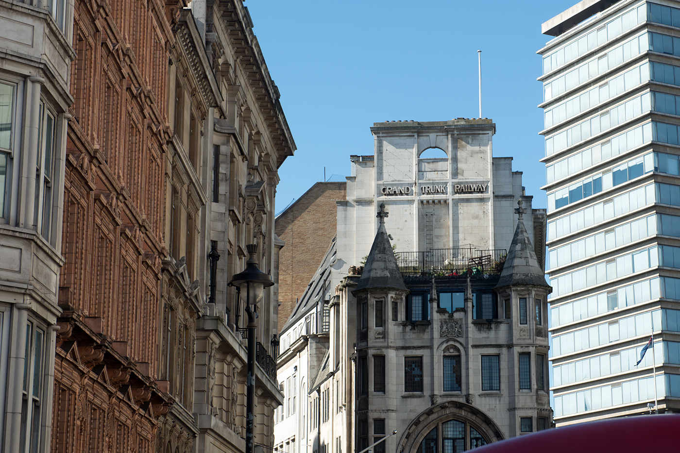 While riding the buses, I happened to look up at random and noticed a familiar banner on top of a building. It was the former headquarters of the Grand Trunk Railway, later occupied by Canadian National Railways and now housing flats and a bus tour company. It was sobering to think that some key GTR personnel had left this building for a tragic ocean voyage on the Titanic.