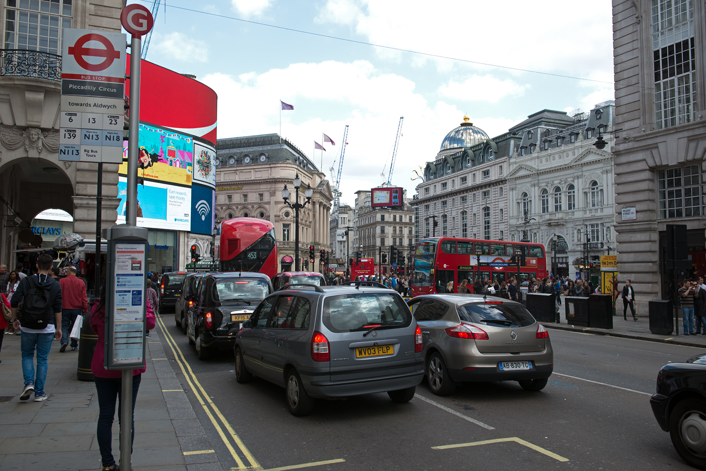 When we pulled into Paddington Station, it was immediately apparent that we weren’t in sleepy Cornwall any longer. The station was packed with people, all charging about at high speed. It took a few minutes to barge our way through the crowds and out to the 215 bus stop. I had our Oyster Cards ready. It was rush hour, and the bus ride to Euston Road took quite a while. No matter – we were in the City, and it was all good to watch.