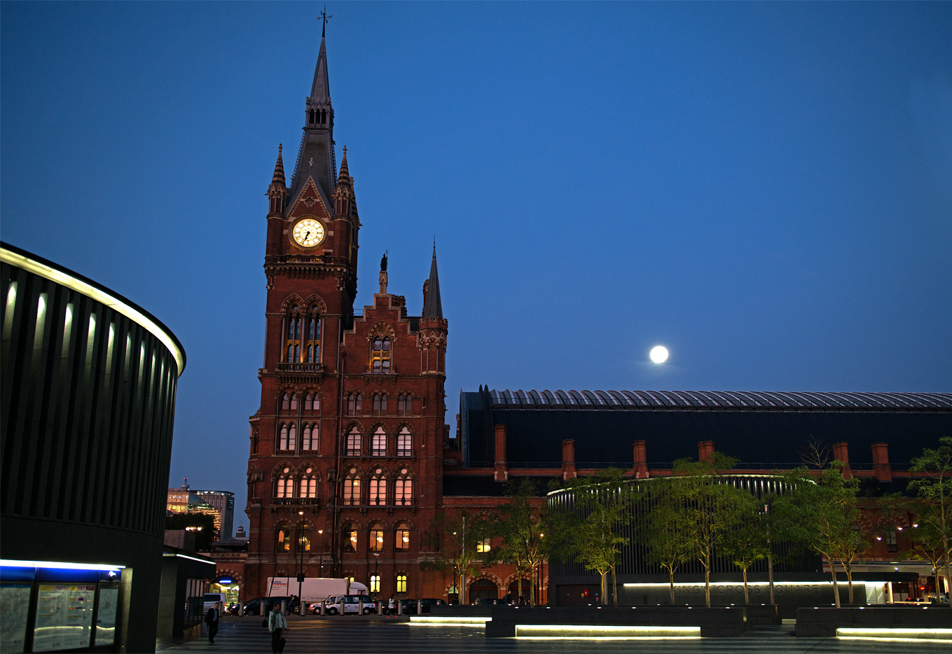 Very early on our final Tuesday in London, I rose especially early, and tiptoed out of our hotel room, leaving Jan to sleep and explore on her own for the day. I walked through quiet, empty streets up to Saint Pancras and over to Kings’ Cross Station. As I arrived at Kings’ Cross, the moon was just setting over the St Pancras trainshed.
