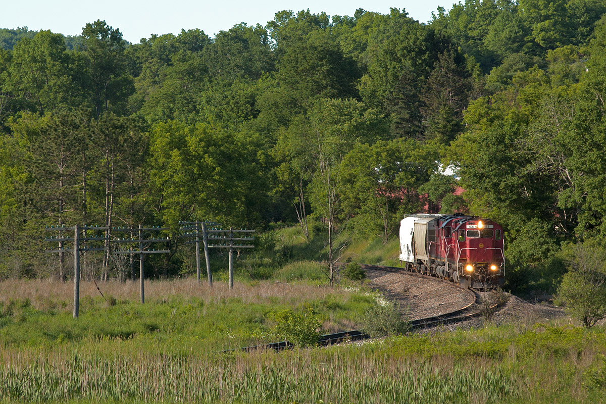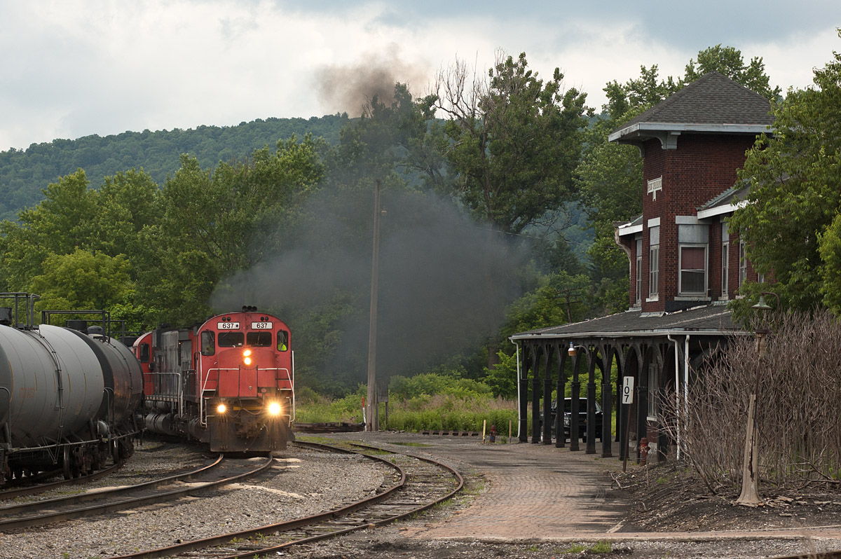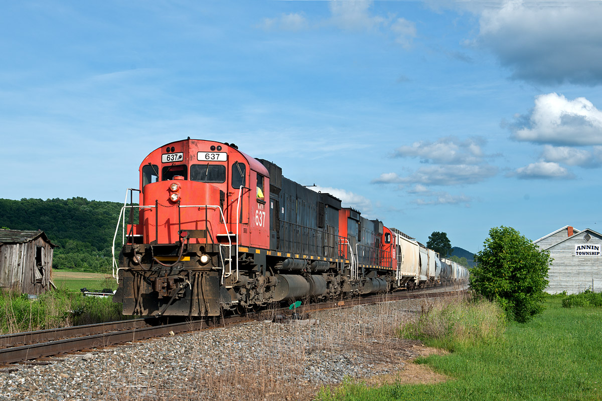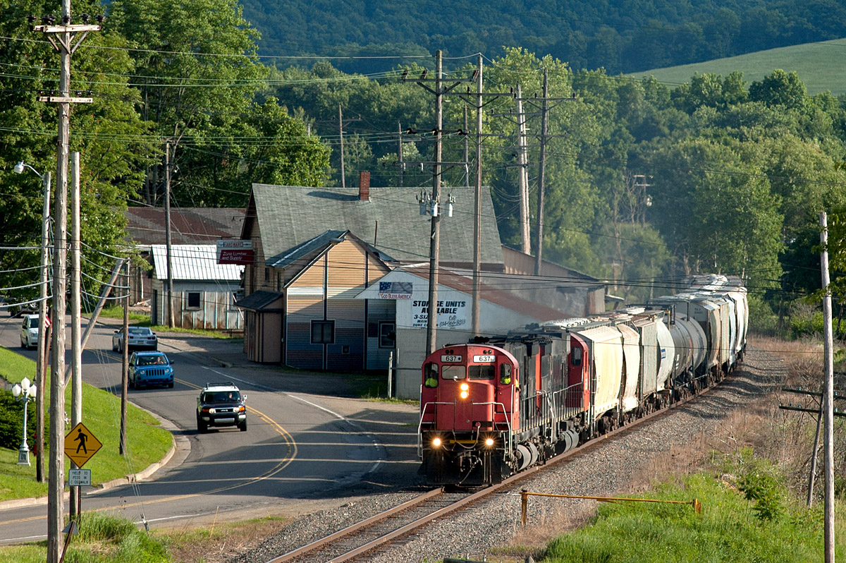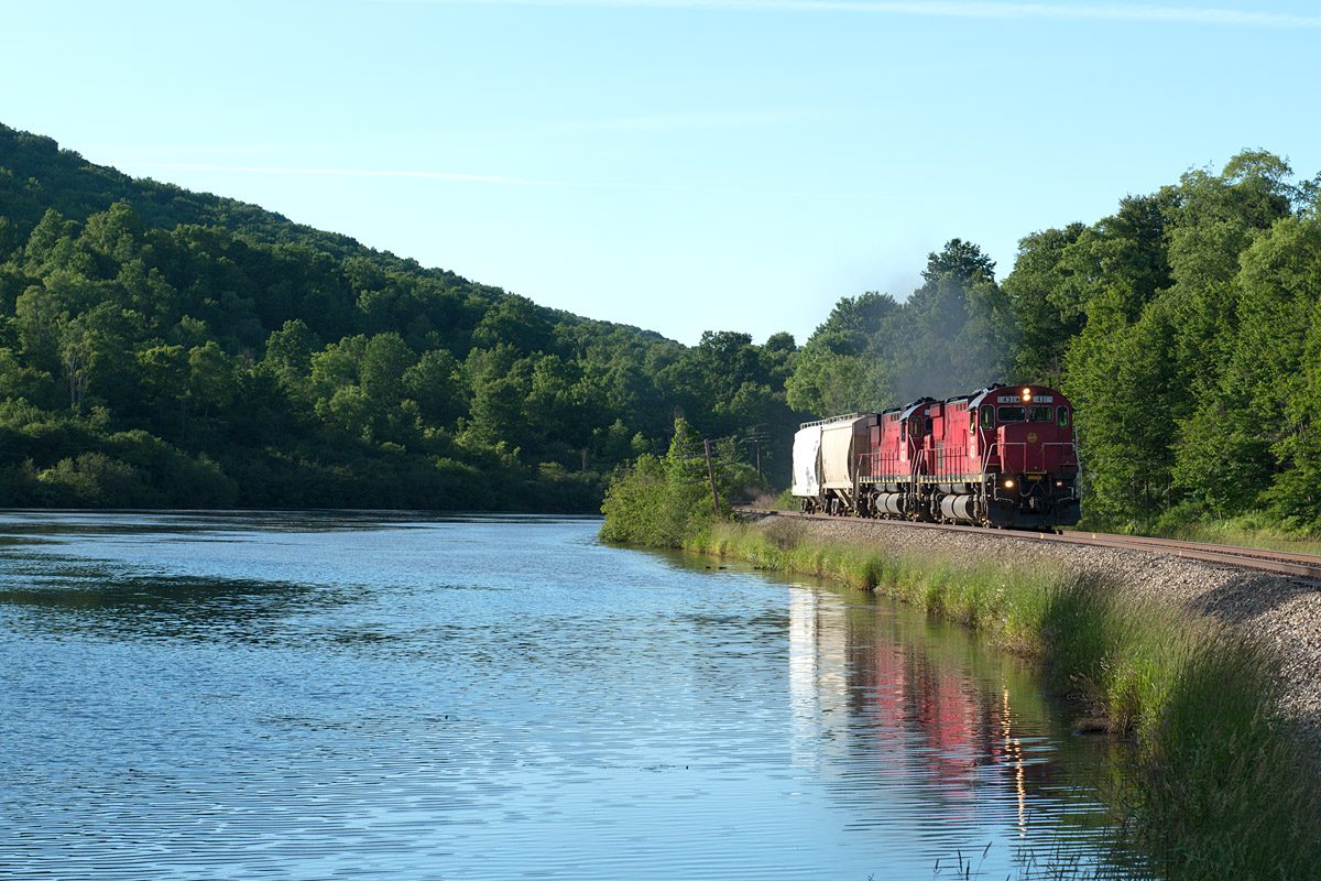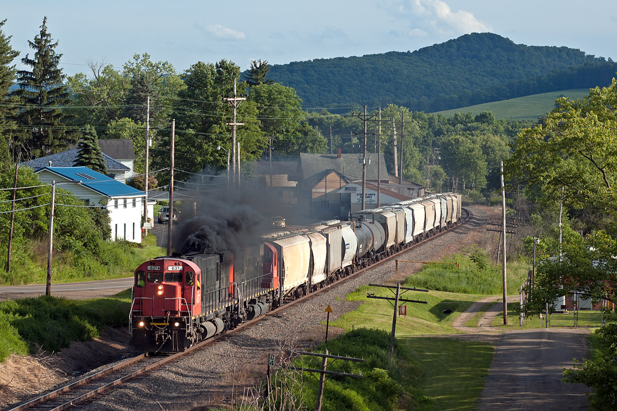 Pardon us if we chased, photographed, and hereby blogged a pair of Big M’s to excess. Over the two days, we caught them on the Driftwood job, then on a quick turn to Pennsylvania for fuel, and finally on the run to Salamanca to interchange tank cars with the quite-invisible B+P.