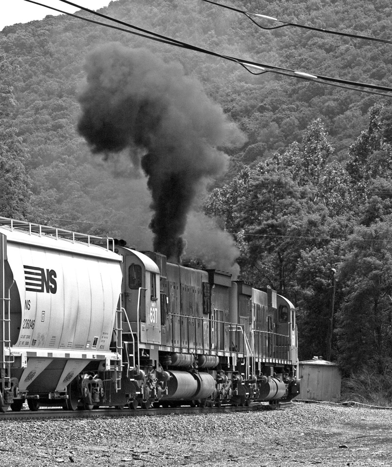 Big M’s 637 and 638 were earmarked for a run over the Keating Mountain to deliver Fracking Sand to a drilling company in Emporium. It was a glorious chase down the winding valley roads. My photos generally show the power with clean stacks, but rest assured: the gritty beasts showed their true colour – soot black – all the way down and back.