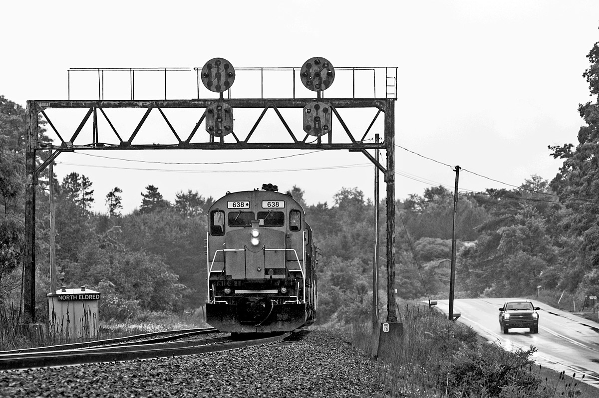 One bad decision needs redress. The funky abandoned signal plant at North Eldred sits alongside a busy road with very poor parking. We staked out the northbound fuel move, which took its time to arrive. Sitting in the rain, becoming rattled by the incessant heavy truck traffic roaring by just inches alongside our car, I impulsively elected to change location – just as the power finally arrived on scene.