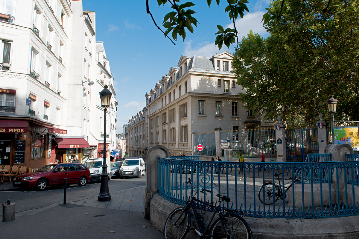 This time, we chose a better class of hotel, but made sure our walking tour took us by the place. The hotel had in fact closed, and the building appeared to have been converted to flats. A restaurant still occupied the ground floor. There was no mistaking the little semicircular “square” in front. The cute wrought-iron railing matched my photos, and while the view at street level was limited, there was just a peek of Notre Dame in just the right spot.