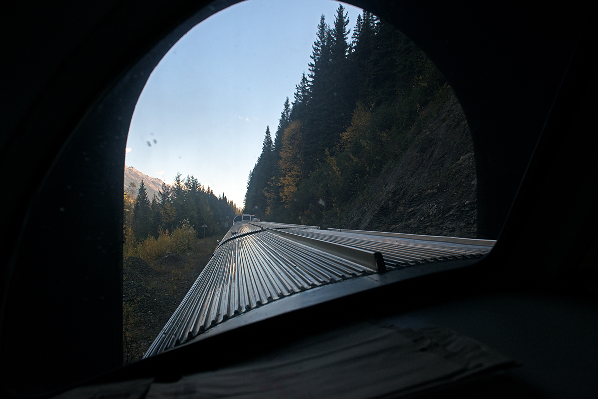 It was another grey morning, but the fall colours in the Canadian Shield were nearing their peak. As the day progressed, the sun came out for a time. There are tunnels on the CN line in Northern Ontario…..have now been there, done that.