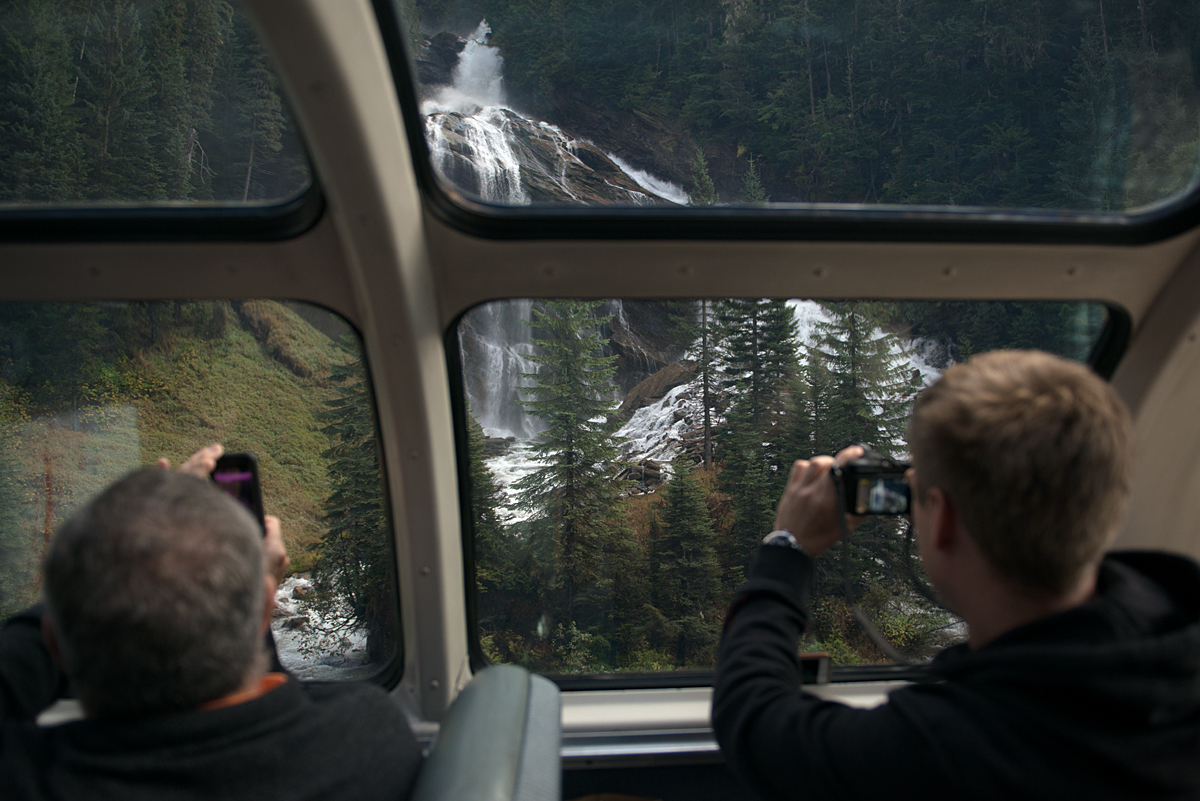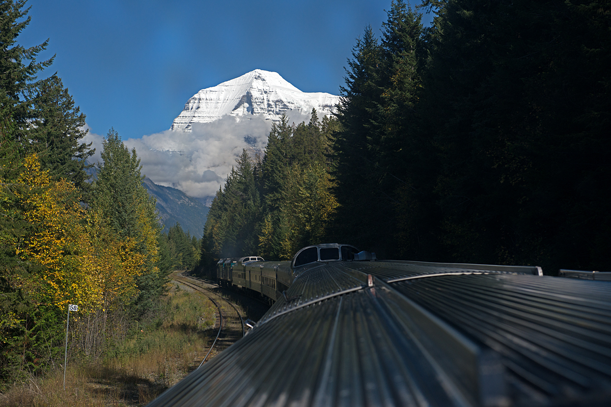 On our first night, we rolled not too badly and managed to get a little sleep. We awoke as the train was leaving Kamloops. This first morning was spent travelling up the North Thompson River valley to the top of the Columbia Mountains. The day began with cloud and mist, but cleared as we went north. The Pyramid Falls, and the passage past Mount Robson, were highlights. The dome stayed full, and we got to know our fellow travellers.