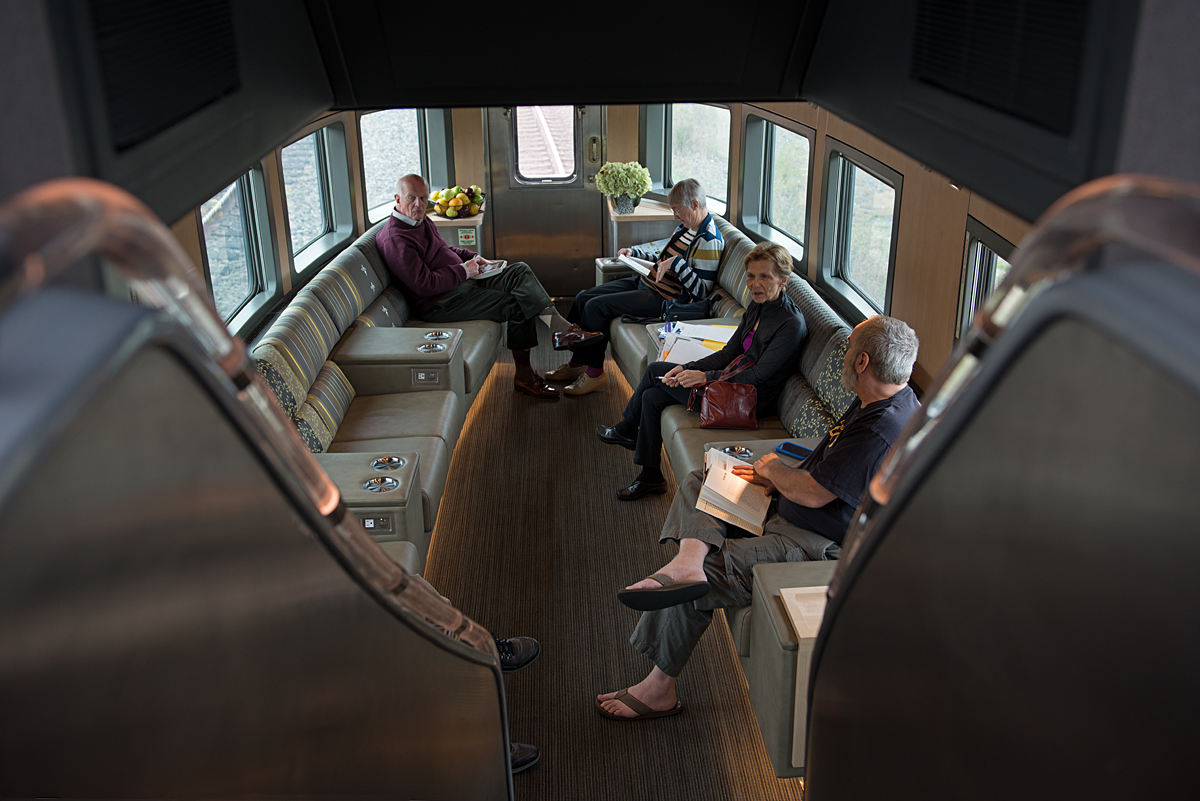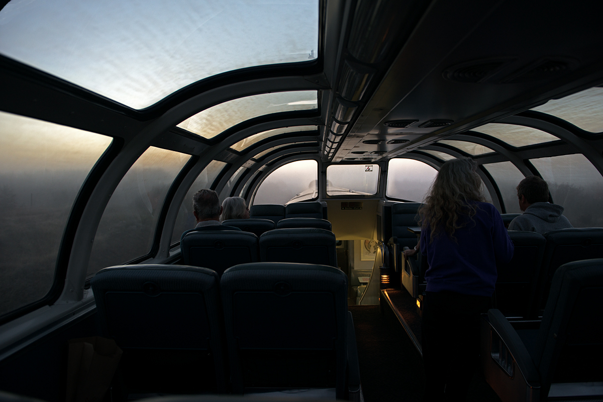 Meanwhile, upstairs in the dome, the countryside rolls by. We spent most of our time up top. At times, the dome would fill with people, creating a convivial rolling party. At other times, the domes would empty….leaving a wonderful peaceful space for quiet contemplation. Don’t get me to the chapel….just hold a seat for me upstairs.