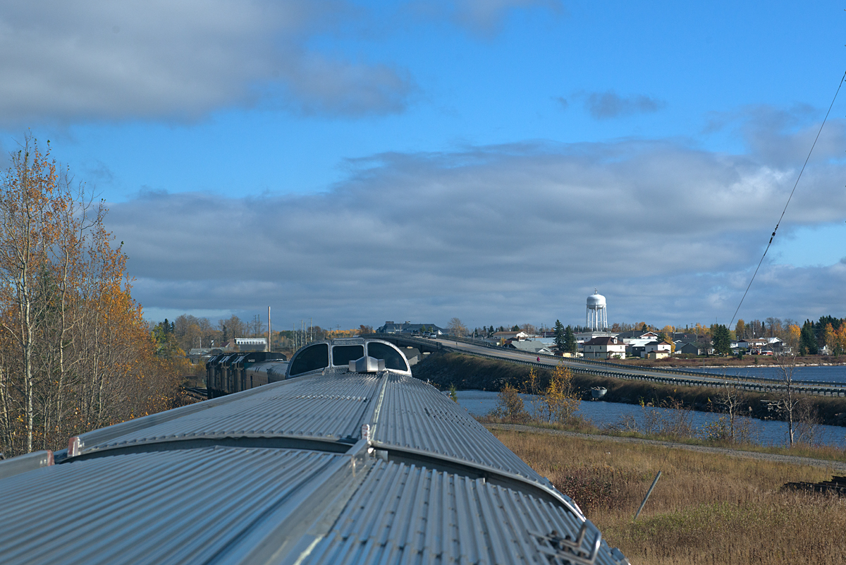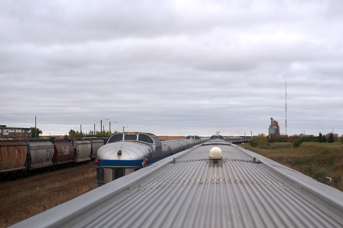 In theory, we should have passed No 1 in the middle of the previous night, somewhere east of Edmonton. As we rolled into Biggar, SK, there in the siding sat Number 1, 9 hours behind schedule itself. Caught by surprise – I figured the train was already in the mountains – I managed a poor grab shot of the trains passing. It sufficed.