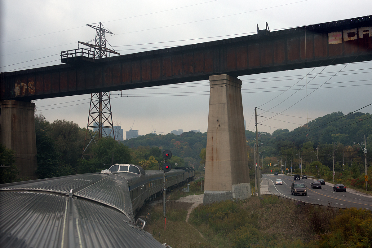 I knew I was almost home when we crossed the Don Valley Parkway and rolled under the CP Viaduct. I had hoped for an arriving shot of the CN tower and the Toronto skyline, but the tower was hidden in cloud. Besides, it was time to say good bye to the dome car and return to our b bedroom to collect our belongings.