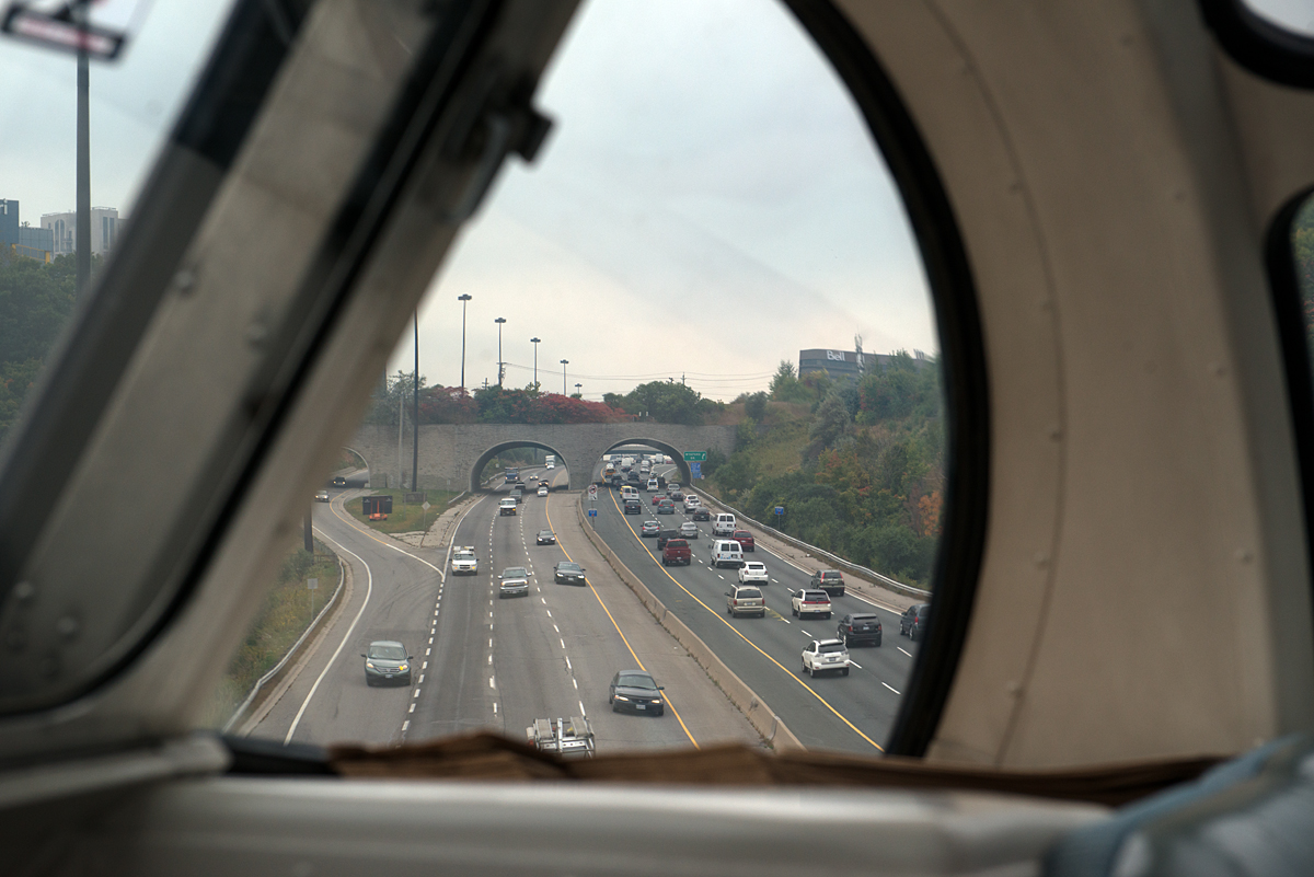 We rolled southwards through the Canadian Shield and on into familiar territory. Near Bala, we rolled over Lake Muskoka. Some familiar millionaires’ cottages were visible across the lake. At Washago, we crossed the Severn River drawbridge. Then it was only a short passage around Lake Simcoe and into Toronto’s northern suburbs.